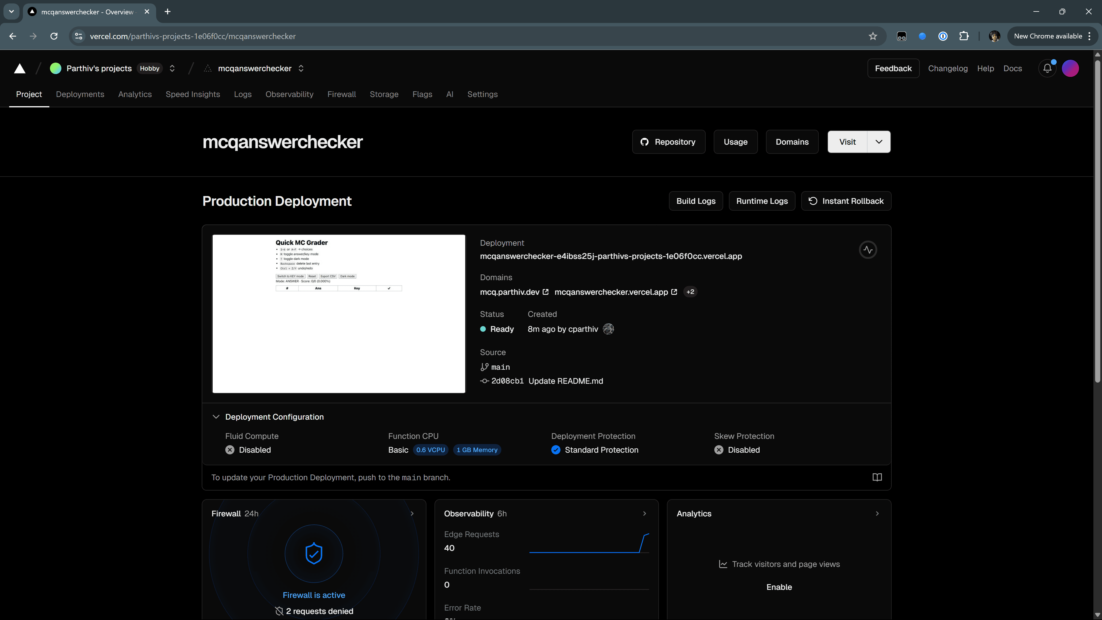 The entire app is one HTML file; Vercel serves it straight from /public with compression out of the box. Deploy time hovers around two seconds, which is shorter than my unit-test suite (i.e., nonexistent).